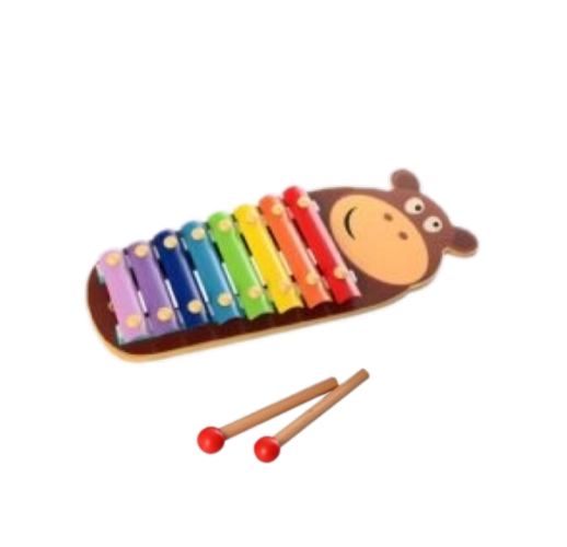 Ксилофон, бегемот  - це розвиваюча музична іграшка, яка складається з дерев'яної основи, дерев'яних паличок і 8 металевих пластин з різною висотою звучання. Зовнішній вигляд іграшки відразу зацікавить дитину, адже кожна пластина інструменту пофарбована в певний колір і відповідає певному звуку. Це дозволить дитині запам'ятовувати і співставляти ноти і кольори.