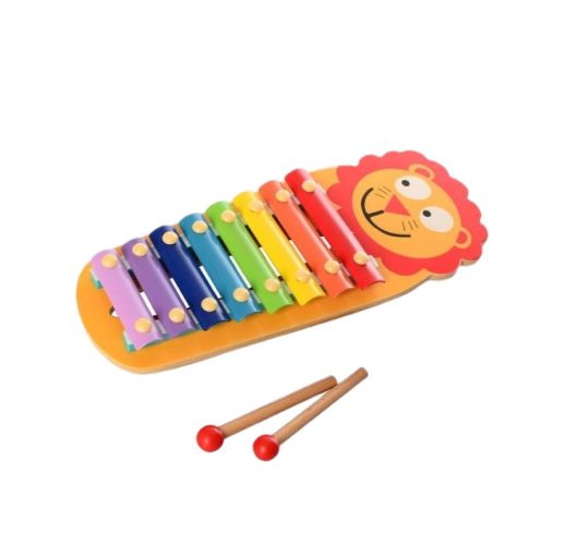 Ксилофон, левеня - це розвиваюча музична іграшка, яка складається з дерев'яної основи, дерев'яних паличок і 8 металевих пластин з різною висотою звучання. Зовнішній вигляд іграшки відразу зацікавить дитину, адже кожна пластина інструменту пофарбована в певний колір і відповідає певному звуку. Це дозволить дитині запам'ятовувати і співставляти ноти і кольори.